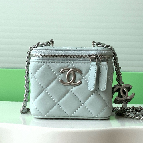 25B 신상 화장품백으로, 부드럽고 고급스러운 양가죽 소재에 생선 비늘 같은 질감이 특징입니다. 진주빛 로고와 더블 C 잠금장치가 포인트로, 섬세하고 고급스러운 디자인을 자랑합니다. 작고 귀여운 사이즈로 어떤 옷에도 잘 어울리며, 손에 들거나 어깨에 걸었을 때 매우 세련된 분위기를 연출합니다.