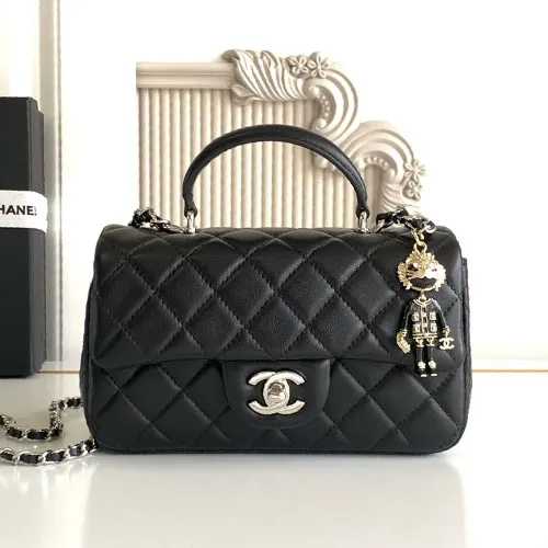 샤넬 CF 뉴미니 램스킨 내장칩 탑핸들 블랙 은장참 20CM #AS2431