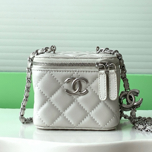 25B 신상 화장품백으로, 부드럽고 고급스러운 양가죽 소재에 생선 비늘 같은 질감이 특징입니다. 진주빛 로고와 더블 C 잠금장치가 포인트로, 섬세하고 고급스러운 디자인을 자랑합니다. 작고 귀여운 사이즈로 어떤 옷에도 잘 어울리며, 손에 들거나 어깨에 걸었을 때 매우 세련된 분위기를 연출합니다.