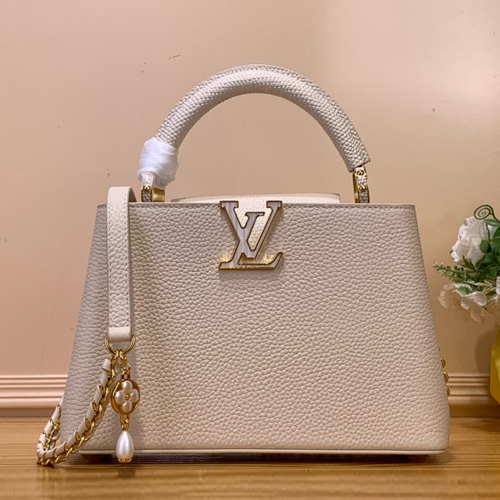 “Capucines Blanche Rêverie(카퓌신 화이트 드림)” 시리즈에서 탄생한 “Capucines Mini” 백은 세련된 우유빛 화이트 컬러에 진주 자개 장식으로 고급스러움을 더했습니다.