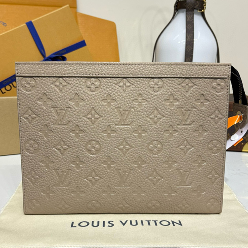 이 루이 비통 포쉐트 보야주 클러치는 고급스러운 엠보싱 모노그램 패턴이 돋보이는 디자인으로, 브랜드의 시그니처 스타일을 현대적으로 재해석했습니다. 은은한 베이지/카키 톤의 소가죽 소재로 제작되어 세련되고 우아한 분위기를 자아내며, 어떤 의상에도 잘 어울리는 뛰어난 활용도를 자랑합니다.