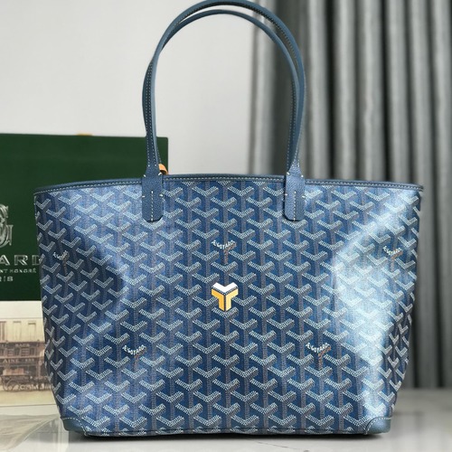 이 토트백은 Goyard의 대표 모델 Artois 시리즈 중 하나로, 기존의 상징적 모델인 Saint Louis의 디자인을 기반으로 더욱 구조적이고 안전한 형태로 재해석되었습니다. 모서리에 네 개의 가죽 코너가 적용되어 견고함을 더했으며, 상단 지퍼 클로저 방식으로 내부 수납물이 노출되지 않도록 설계되어 있습니다. 내부에는 플로팅 포켓이 있어 소지품을 정리하기에 편리하며, 본 모델은 ‘진주광(珠光藍)’이라고 표현된 블루 색상으로 한정 출시되어 시각적으로도 특별함을 더합니다. 브랜드 공식 설명에 따르면 소재는 고야드린 캔버스(Goyardine Canvas)와 베이비 송아지 가죽(Chevroches Calfskin)으로 제작되었습니다.