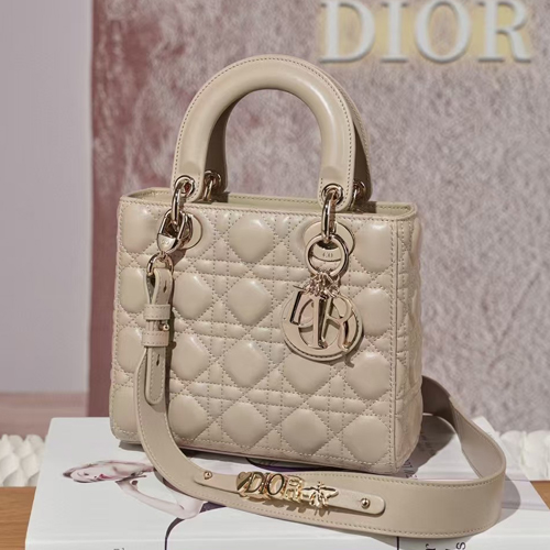 Lady Dior My ABCDior 핸드백은 디올의 우아함과 아름다움을 완벽히 구현한 대표적인 디자인입니다. 부드러운 양가죽으로 정교하게 제작되었으며, 깔끔한 카나주 퀼팅 스티치가 특징입니다. 은은한 금빛 하드웨어와 D.I.O.R. 펜던트가 세련미를 더하며, 작지만 고급스러운 존재감을 자랑합니다. 어깨 스트랩에는 커스터마이즈 가능한 이니셜 장식이 포함되어 개성을 표현할 수 있으며, 손에 들거나 크로스로 착용이 가능합니다.