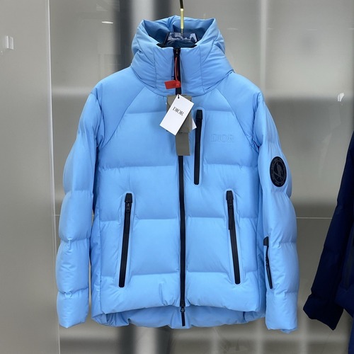 디올과 데상트의 콜라보레이션으로 탄생한 다운 스키 재킷입니다. 하늘색 색상과 전면의 DIOR 로고가 특징입니다.