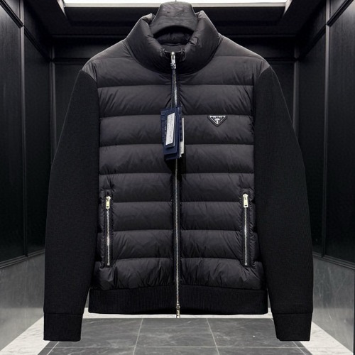 프라다의 Re-Nylon 패딩 자켓입니다. 몸통 부분은 95% 솜털과 5% 깃털로 채워진 패딩으로 보온성을 높였고, 소매는 울 소재로 제작되었습니다. 앞면에는 지퍼 여밈과 지퍼 포켓이 있으며, 왼쪽 가슴에는 프라다의 상징적인 삼각 로고가 부착되어 있습니다.