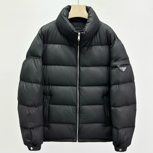 PRADA의 시그니처인 리나일론 소재로 제작된 다운 재킷입니다. 높은 칼라와 볼륨감 있는 실루엣이 특징이며, 가슴 부분의 삼각 로고 패치가 포인트입니다.