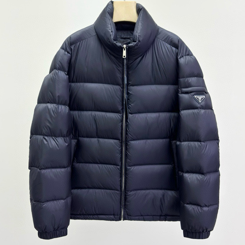 PRADA의 남성용 다운 재킷입니다. 심플한 디자인에 PRADA 로고가 미세하게 새겨져 있어 고급스러움을 더합니다.