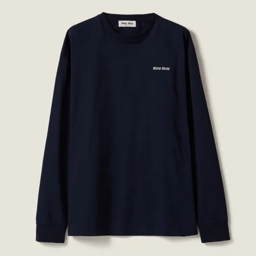미우미우의 시그니처 로고가 새겨진 네이비 컬러 긴팔 니트 티셔츠입니다. 브랜드를 대표하는 니트 소재로 제작되었으며, 섬세한 염색 공정을 거쳐 완성되었습니다.