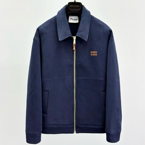 이 제품은 미우미우의 Miu Miu 로고 프린트 집업 재킷입니다. 두께감은 적당하며, 안감은 기모 처리가 되어 있지 않습니다. 칼라 디자인과 집업 스타일로 캐주얼하면서도 세련된 느낌을 줍니다.