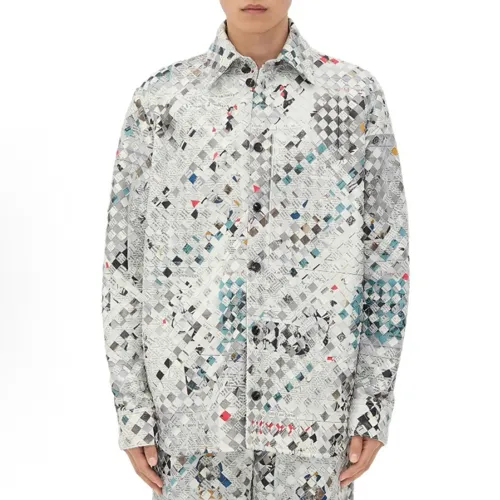 보테가 베네타(Bottega Veneta)의 개성 있는 신문 프린트 디자인이 돋보이는 양가죽 셔츠 자켓입니다.