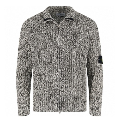 스톤아일랜드 멜란지 컬러 울 집업 니트 가디건. 7가지 서로 다른 색실을 조합하여 만든 맞춤 염색 원사를 사용했으며, 굵고 섬세한 실의 배열로 완벽한 멜란지 질감을 구현했습니다.