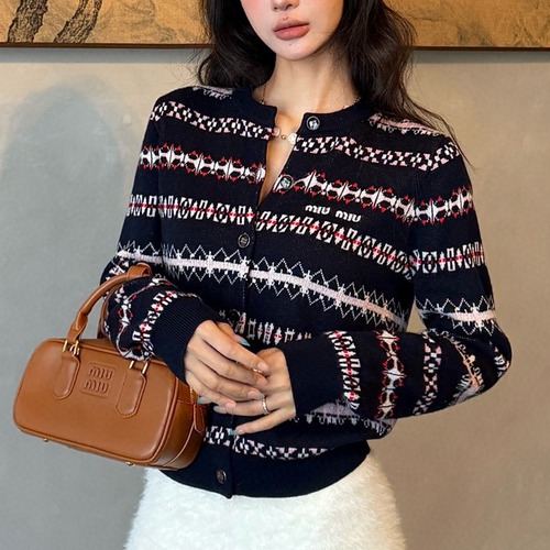 Miu 25 신상 로고 니트 가디건으로, 세련된 패턴과 고급스러운 질감이 돋보이는 디자인입니다. 중앙 버튼 여밈 방식이며, 부드럽고 탄탄한 니트 원사로 제작되어 착용 시 슬림해 보이는 효과가 있습니다. 캐주얼과 포멀 모두 잘 어울리며, 어떤 스타일에도 쉽게 매칭 가능합니다.