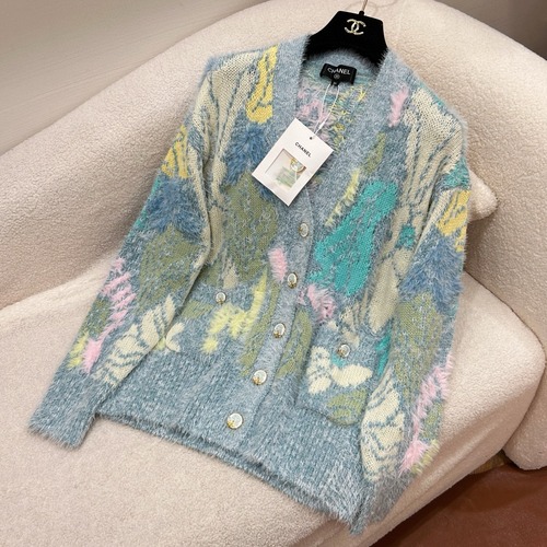 로맨틱한 파스텔 컬러 조합이 돋보이는 샤넬 플로럴 패턴 V넥 가디건입니다.