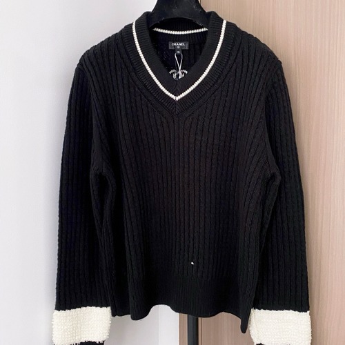 Chanel 샤넬 블랙 화이트 배색 니트 브이넥 스웨터