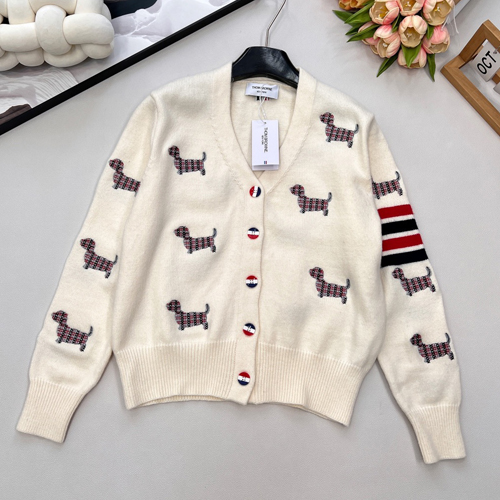 새로운 스타일의 톰브라운 닥스 자수 니트 가디건입니다. 복고풍의 현대적인 감성과 귀여운 닥스 패턴이 조화를 이루어 사랑스러운 일상 룩을 연출합니다.