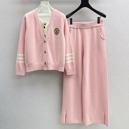 Thom Browne 스타일의 아카데미풍 투피스 세트로, 가디건과 일자 팬츠 구성입니다. 고급 울·양모 혼방 니트 소재로 보온성이 뛰어나며, 뛰어난 신축성과 부드러운 촉감이 특징입니다. 가디건에는 엠블럼 자수가 포인트로 들어가 있으며, 심플하면서도 고급스러운 디자인으로 일상이나 외출 시 다양하게 매치하기 좋습니다. 탄탄한 짜임으로 형태 변형이 적고, 가을·겨울 시즌 레이어드용으로도 적합합니다.