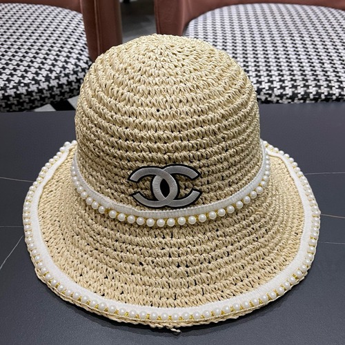 샤넬에서 선보이는 라피아 소재의 여름 햇입니다. 햇 챙 부분에 진주 장식이 더해져 고급스러움을 더했습니다. 햇 중앙에는 샤넬 로고가 포인트로 디자인되어 있습니다.