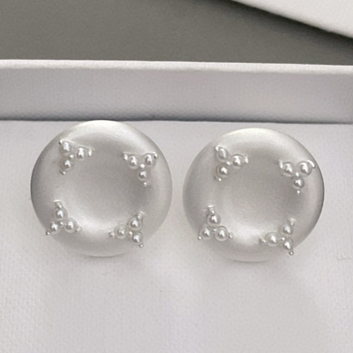 이 제품은 925 실버로 제작된 귀걸이로, 독특하고 세련된 디자인이 돋보입니다. 둥근 모양의 귀걸이 표면에 작은 진주알들이 촘촘하게 장식되어 있어 고급스러움을 더합니다. 빛을 받으면 은은하게 반짝이는 실버의 질감이 섬세한 수공예 기술을 보여줍니다.